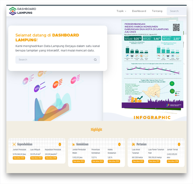 Sebuah platform yang menyajikan informasi melalui visualisasi yang informatif, terintegrasi, mutakhir, dan dapat diandalkan untuk pengambilan kebijakan berbasis data yang terukur bagi pemerintah dan sarana edukasi bagi masyarakat.